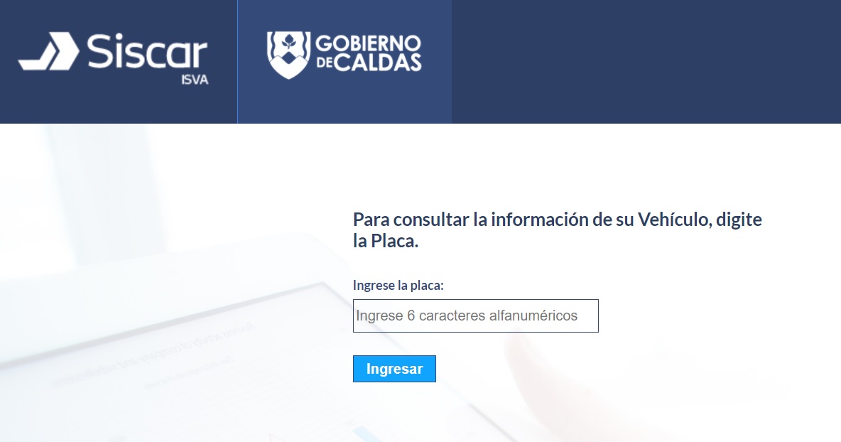Lo primero que debe hacer es ingresar a la plataforma de liquidación del impuesto vehicular de Caldas, podrá acceder por medio de este enlace, una vez ingrese deberá digitar el número de la placa sin espacios ni guiones, por ejemplo, AMQ123.