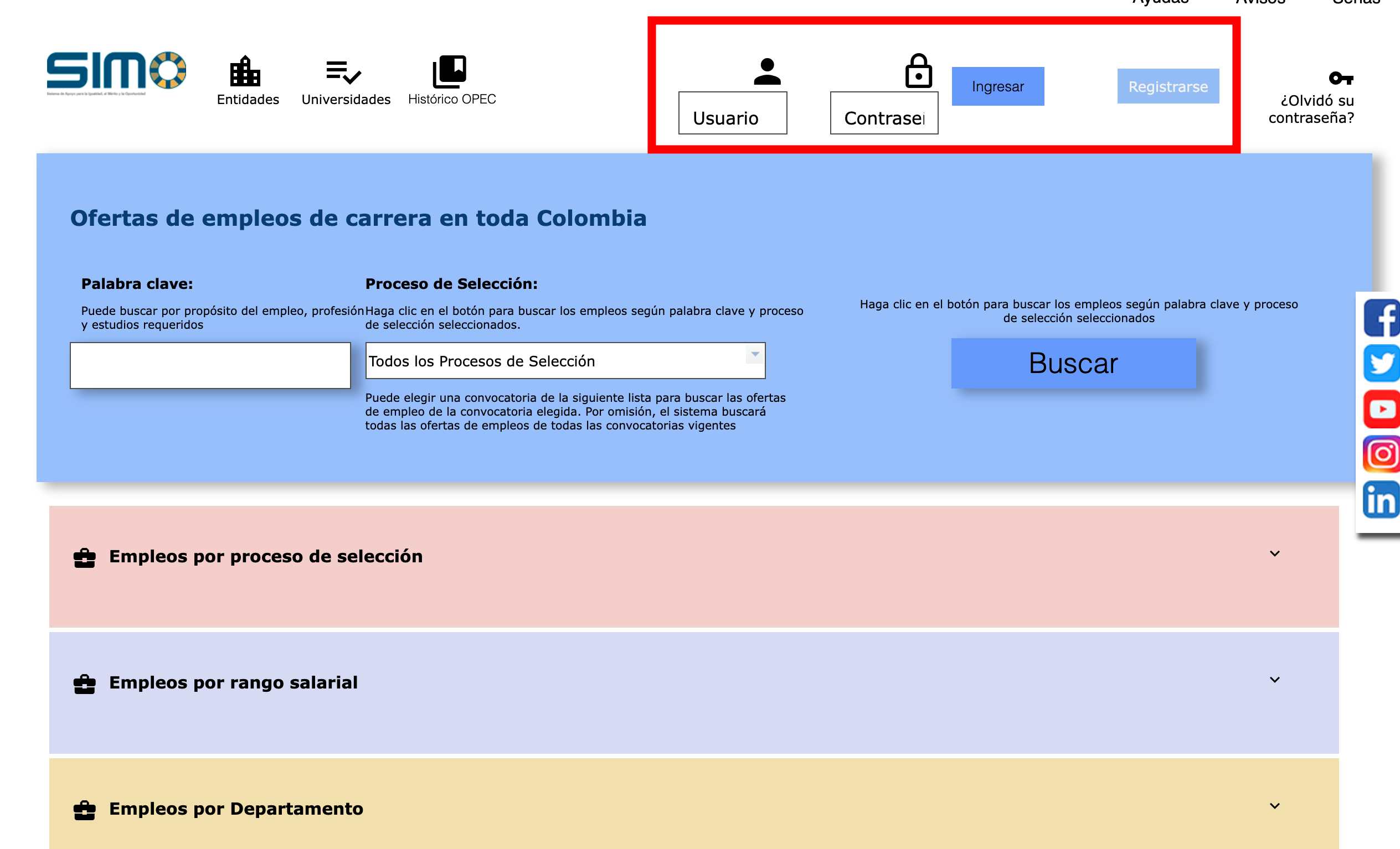 SIMO, el Sistema de Apoyo para la Igualdad, el Mérito y la Oportunidad de la Comisión Nacional del Servicio Civil (CNSC), es la plataforma donde los ciudadanos pueden registrar su hoja de vida, consultar vacantes de carrera administrativa, pagar los derechos de participación e inscribirse a los procesos de selección del Estado colombiano.
